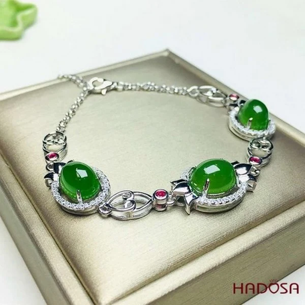 Lắc tay ngọc bích kết hợp bạc 925 tại HADOSA là sự hòa quyện tinh tế giữa sắc xanh thanh mát của ngọc tự nhiên và ánh sáng sang trọng từ bạc cao cấp. Thiết kế thanh lịch, điểm nhấn kim loại sáng bóng giúp tôn lên vẻ đẹp trang nhã, đồng thời mang ý nghĩa bình an, tài lộc và bảo hộ trong phong thủy, phù hợp để đeo hằng ngày hoặc làm quà tặng ý nghĩa.