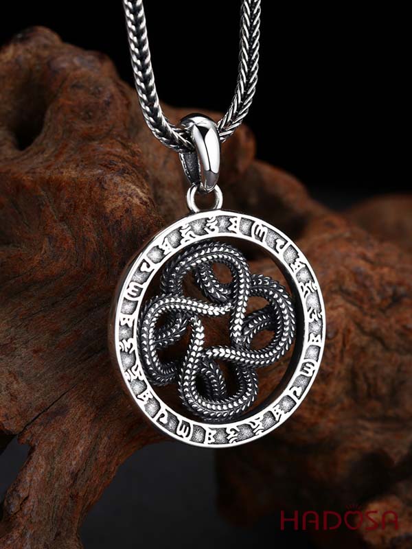 Mặt dây chuyền “Rắn Xà Linh Hộ Mệnh” được thiết kế dựa trên biểu tượng 4 xà linh đan xen nhau, tượng trưng cho bảo hộ tâm linh – trí tuệ – quyền năng và sự chuyển hóa. Bao quanh là vòng tròn chữ cổ, như một tấm khiên bảo vệ giúp chủ nhân vượt qua những nguồn năng lượng tiêu cực và thu hút bình an, may mắn.