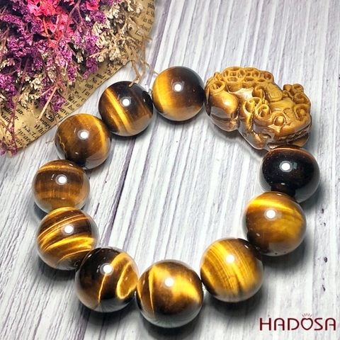 Vòng Thạch Anh Mắt Hổ vàng nâu 18mm mix tỳ hưu đá