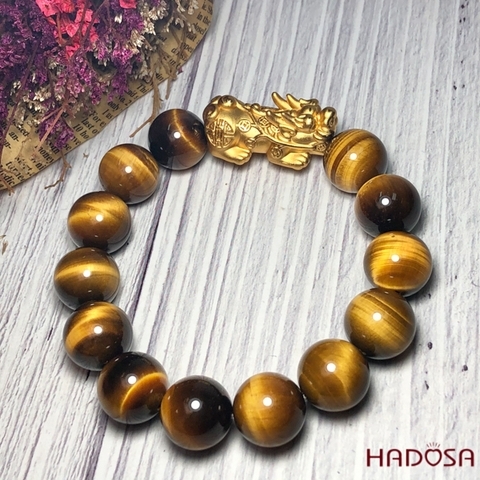 Vòng Thạch Anh Mắt Hổ vàng nâu 14mm mix tỳ hưu bạc mạ vàng