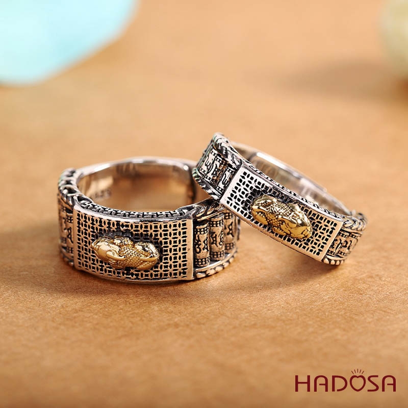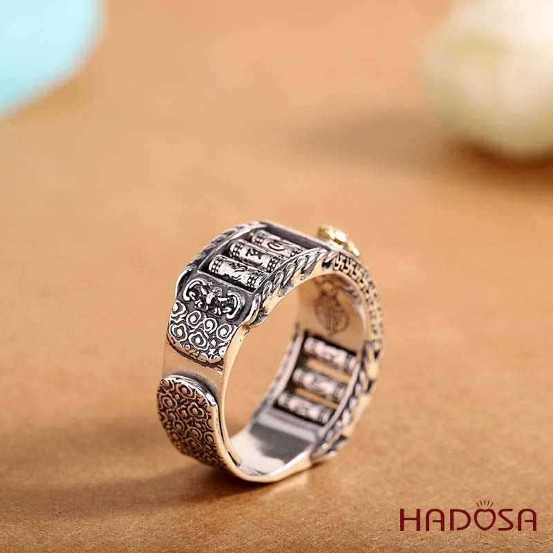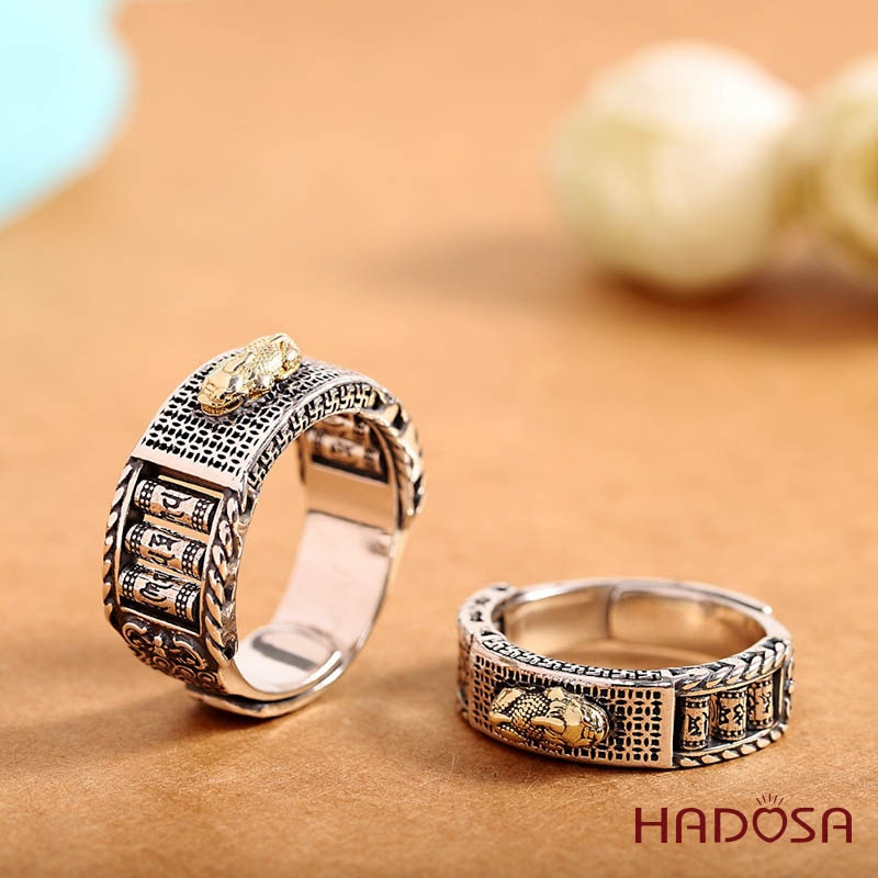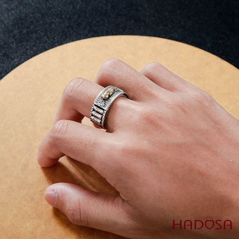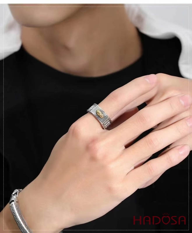 “Nhẫn bạc nam Tỳ Hưu Tài lộc” hội tụ tinh hoa của bạc Thái 925 cùng biểu tượng Tỳ Hưu – linh vật phong thủy chuyên chiêu tài hút lộc. Phần thân nhẫn được trang trí bánh xe luân hồi xoay linh hoạt, khắc kinh “Om mani padme hum” trên trục quay, tượng trưng cho công đức, vòng luân hồi của phúc đức. Thiết kế nổi bật hình với họa tiết Tỳ Hưu chạm nổi 3D sắc sảo, thân nhẫn đúc dày, vững chắc mang lại sự uy quyền, mang đến vẻ sang trọng, khẳng định đẳng cấp phái mạnh.
