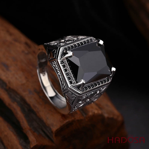- Đá chủ: Hắc ngọc (Đá CZ nhân tạo/Onyx/Obsidian tổng hợp) đen tuyền – màu của mệnh Mộc Thủy. Kích thước đá: 12mmx16mm