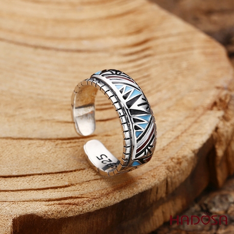 Nhẫn bạc Thái mở họa tiết hình học bộ lạc