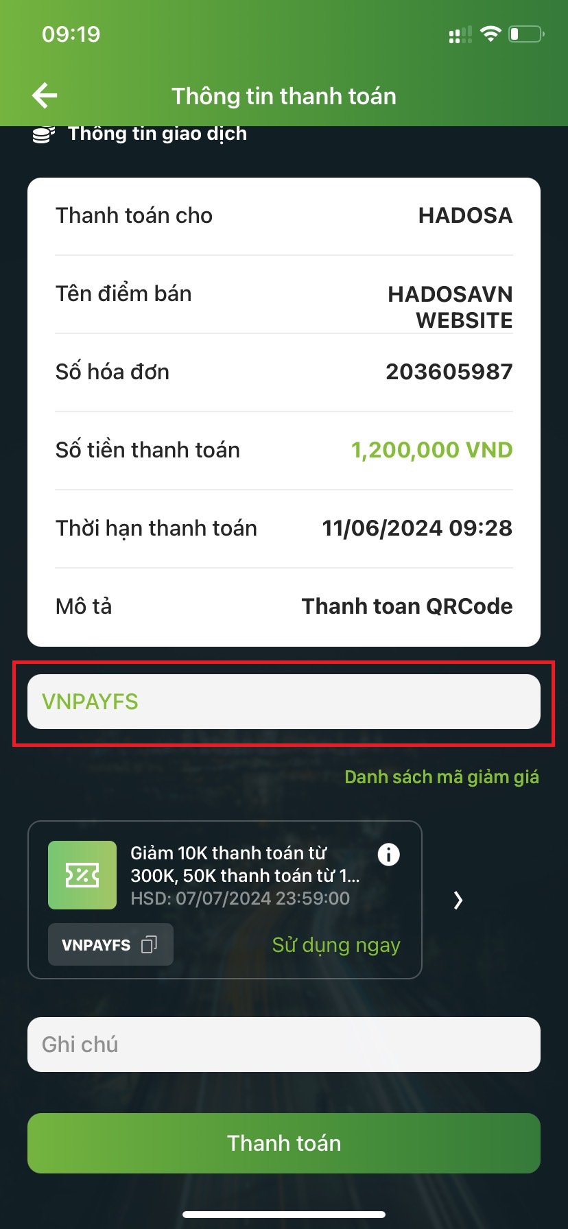 Bước 5: Mở ứng dụng ngân hàng (thuộc danh sách ngân hàng được áp dụng khuyến mại) và quét mã thanh toán. Nhập VNPAYFS ở ô Nhập mã giảm giá