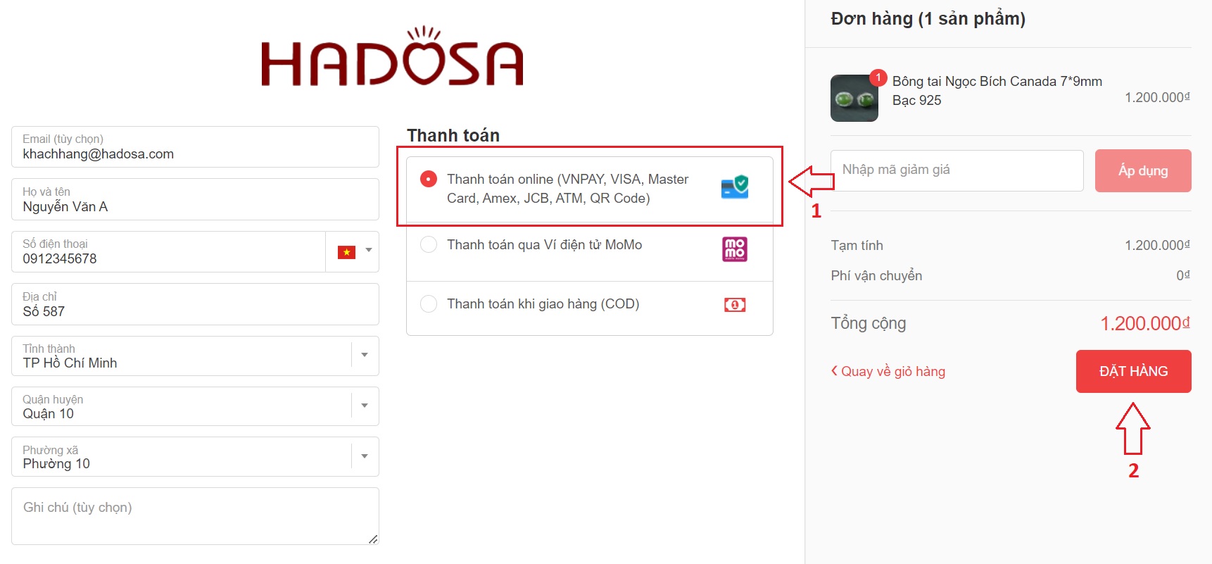 Bước 3: Nhập thông tin và chọn phương thức thanh toán "Thanh toán online (VNPAY, VISA, Master Card, Amex, JCB, ATM, QR Code)" và click vào “ĐẶT HÀNG”