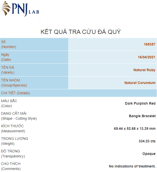 Vòng kiềng Ruby Nam Phi cao cấp ni 52 đã được kiểm định tại trung tâm giám định đá quý PNJ.