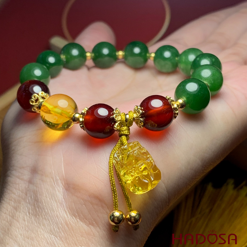 - Chất liệu: Đá Ngọc Bích Canada - Đá Garnet - Hổ phách tự nhiên.