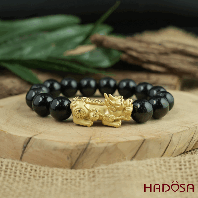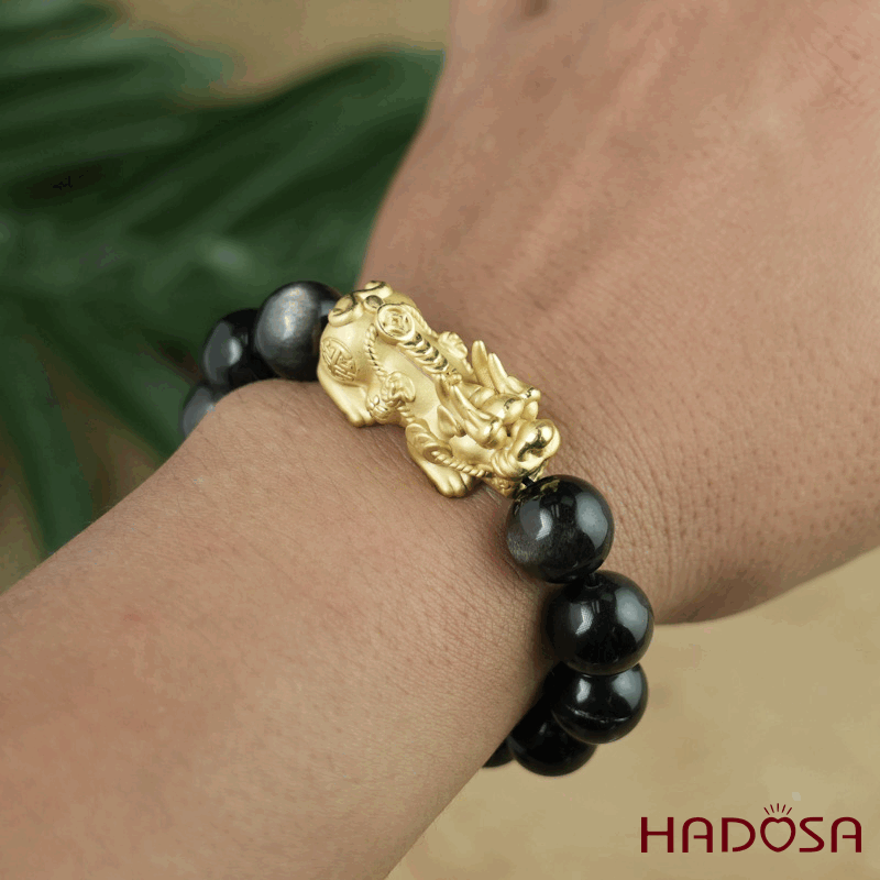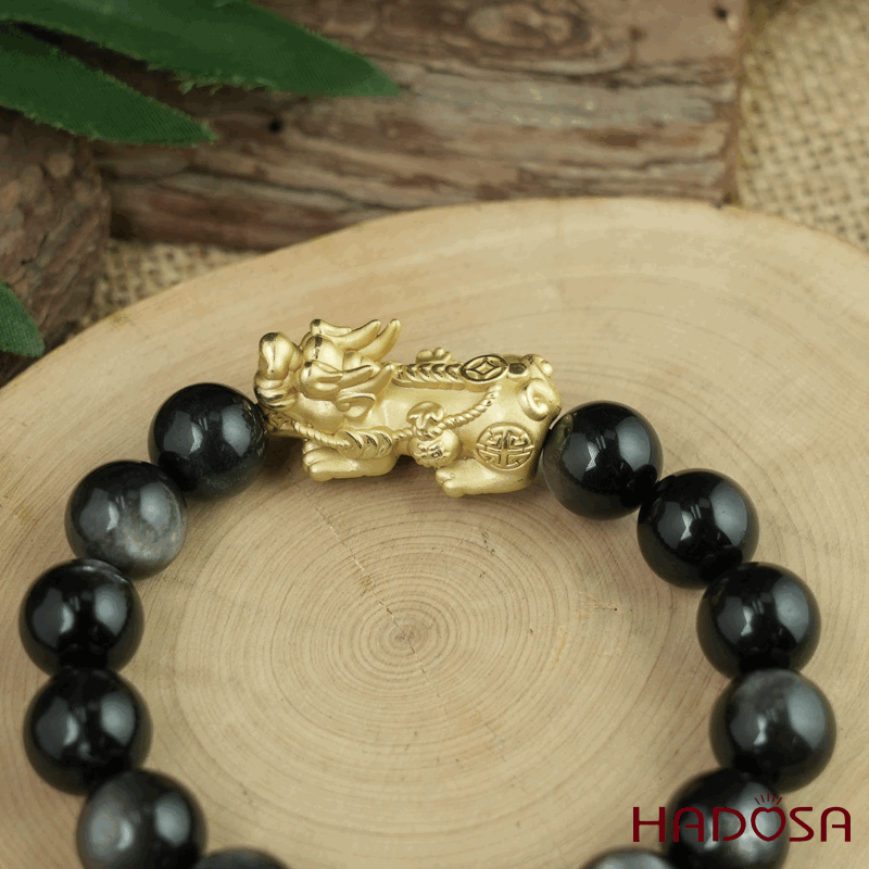 Vòng tay đá Obsidian-Hắc Diện Thạch ánh bạc 12mm mix tỳ hưu bạc mạ vàng