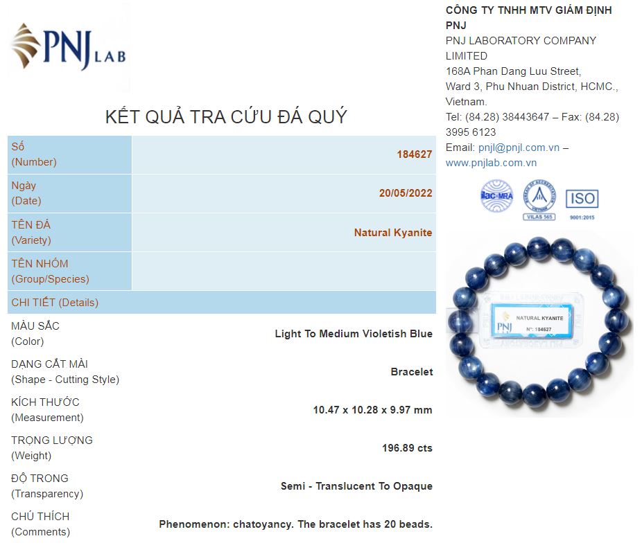 Phiếu kiểm định vòng tay đá Kyanite 10mm cao cấp