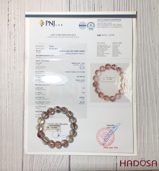 Hơn nữa, nếu bạn băn khoăn về việc vòng tay thạch anh tóc đỏ thật, giả lẫn lộn trên thị trường hiện nay thì để đảm bảo sở hữu được vòng tay thạch anh tóc đỏ hoàn toàn tự nhiên, TRANG SỨC ĐÁ QUÝ ĐÁ PHONG THỦY CAO CẤP HADOSA là địa chỉ uy tín nhất dành cho bạn. Chúng tôi nhận được đánh giá cao từ nhiều khách hàng trong nhiều năm qua về sản phẩm vòng tay thạch anh tóc đỏ chất lượng tốt nhất trên thị trường. Đặc biệt, tất cả vòng tay thạch anh tóc đỏ tại TRANG SỨC ĐÁ QUÝ ĐÁ PHONG THỦY CAO CẤP HADOSA đều được giám định đầy đủ và có giấy chứng nhận tại các trung tâm kiểm định đá quý uy tín như: PNJ, LIULAB, DOJI.
