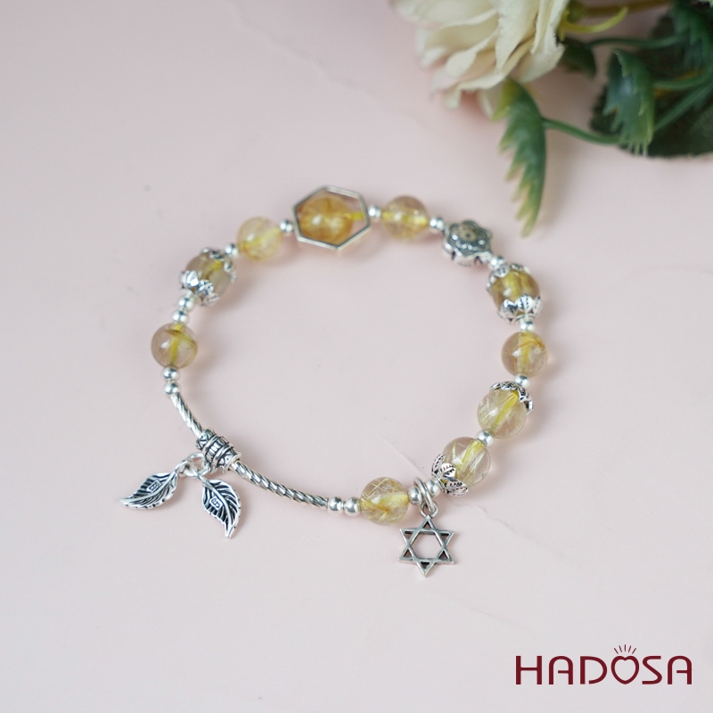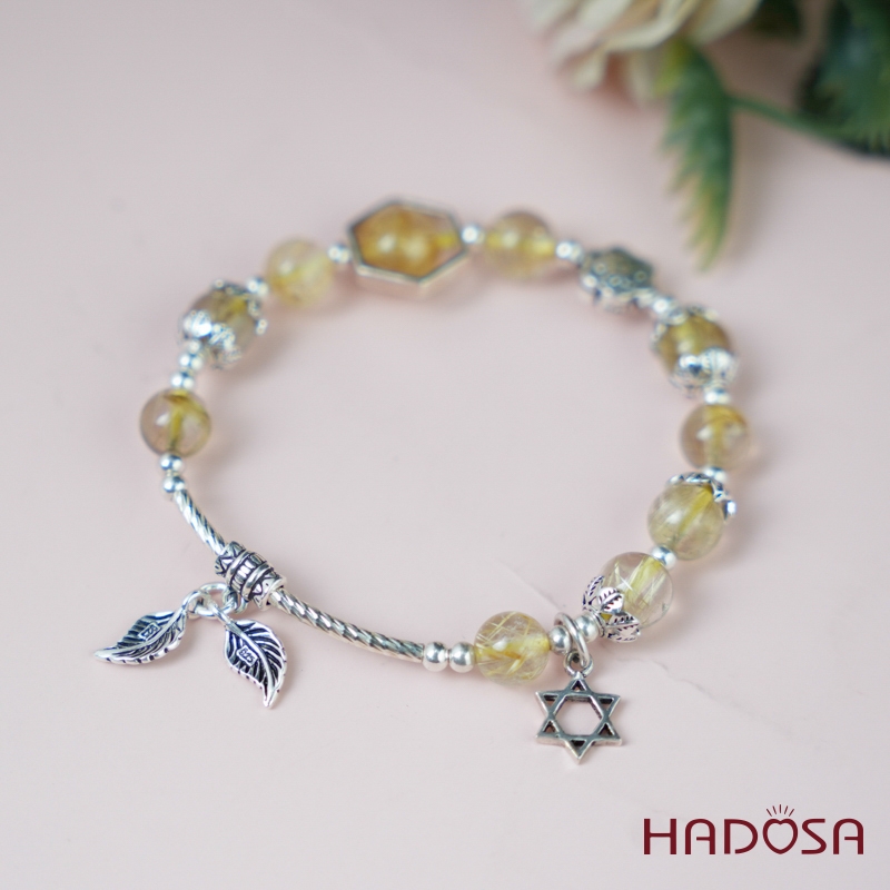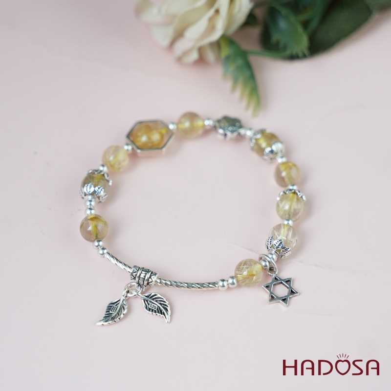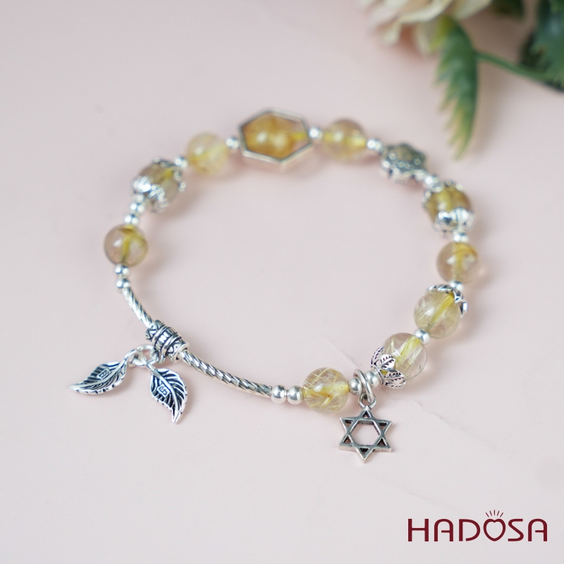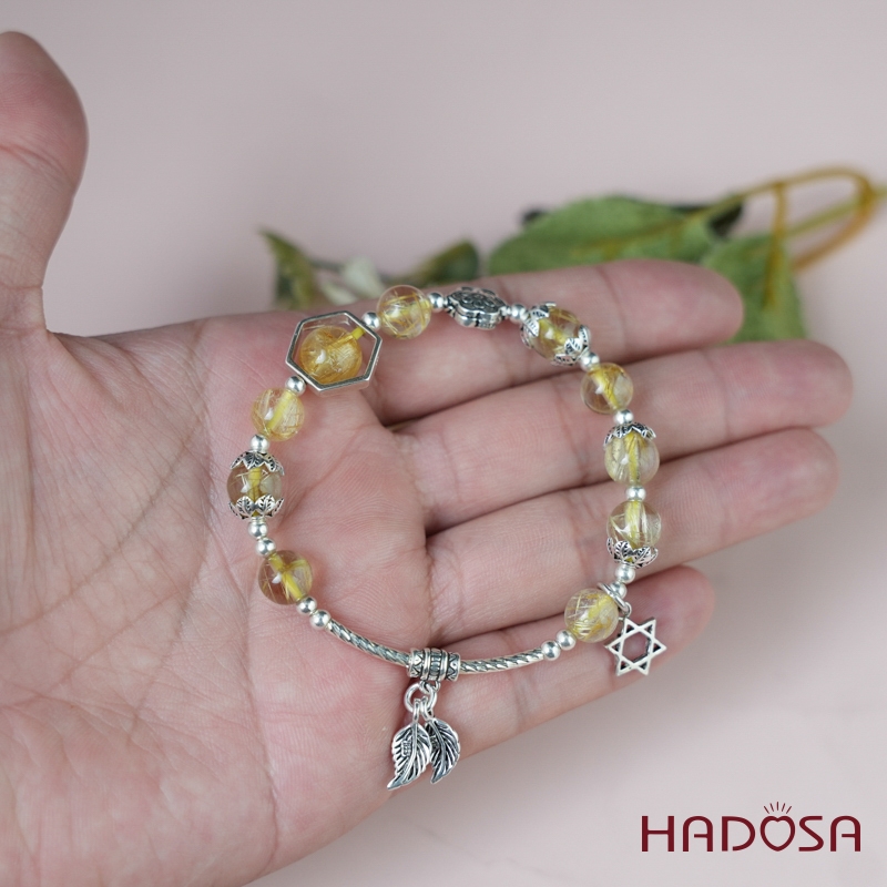Vòng thạch anh tóc vàng 7mm mix charm bạc 925